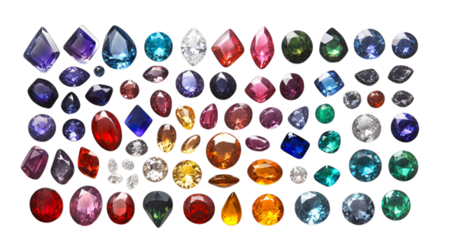 Assorted faceted gemstones sparkling isolated on a transparent background