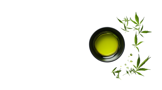 Hemp Leaves and Oil in White Bowl on Background, Top View