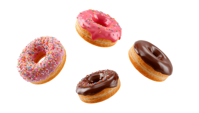 Delicious assortment of donuts with various toppings floating on transparent canvas