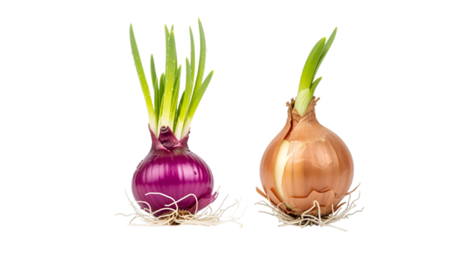 Two freshly harvested onions, one red and one brown, showcasing vibrant green shoots emerging from their tops against black background