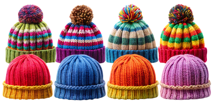 Colorful knitted winter hats with pom poms on white background isolated on a transparent background