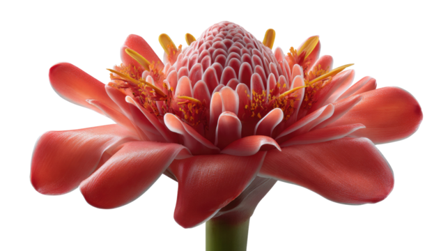 Bird of Paradise Torch Ginger and Red Ginger, detailed studio photograph of tropical sculpted inflorescences, with transparent background