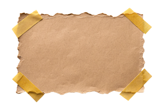 Brown kraft paper with rough torn edges attached by yellow tape pieces at corners, isolated on a transparent background