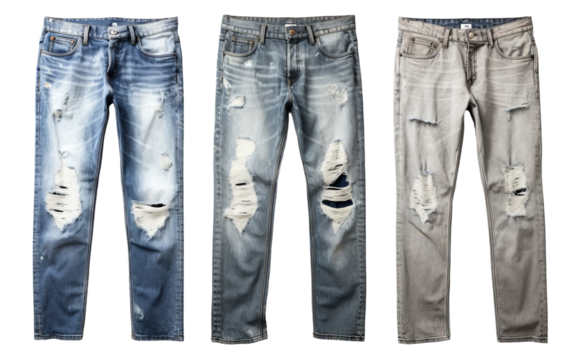 Three unique colored jeans with stylish distressed holes in artistic arrangement
