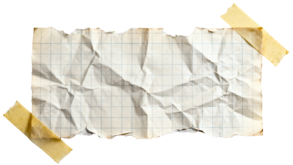 Vintage crumpled grid paper texture with torn edges and tape, isolated on transparent background