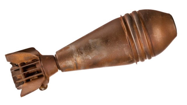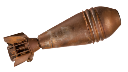 Projectile, bomb, rocket isolated on white background. Large exploding military weapon, dropped from the air. The shell of the second world war.