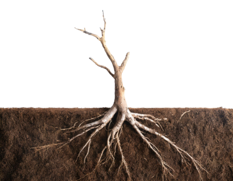 Close up of a root of tree on ground white background no shadow and copy space for text
