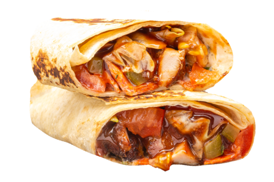 A Shawarma pita roll with chicken isolated on transparent or white background, png