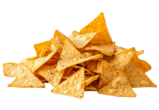 Pile of crispy, seasoned tortilla chips with a golden texture, isolated on transparent background, perfect for snack, food, or menu design.