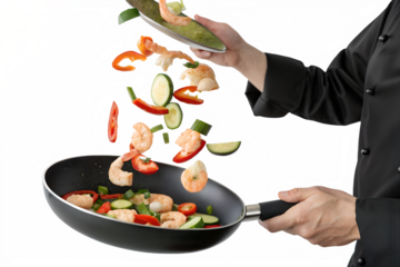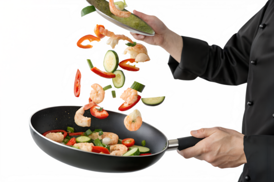 Professional chef in a black uniform skillfully tossing a colorful stir-fry with fresh shrimp and vegetables in a pan, isolated on a white background