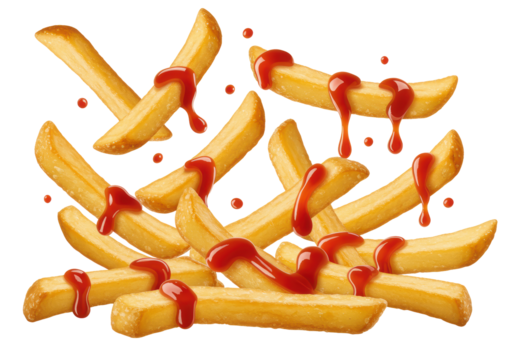 Golden-brown, crispy French fries tossed mid-air, with vibrant red ketchup generously dripping and streaking, isolated on a transparent background, dynamic food advertising concept