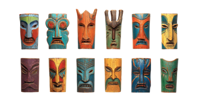 Wooden carved totem figure with wide eyes, geometric patterns and traditional indigenous design elements, isolated on a transparent background