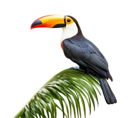 Colorful toucan bird perched on palm branch, isolated on transparent cutout background
