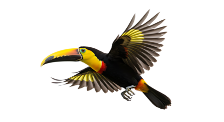 Flying toucan in tropical forest wildlife colorful bird isolated on transparent background