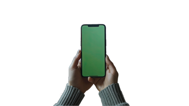 Over the Shoulder Shot of a Person Holding an Mobile With a Completely Green Screen. Isolated on a Transparent Background. Cutout PNG.