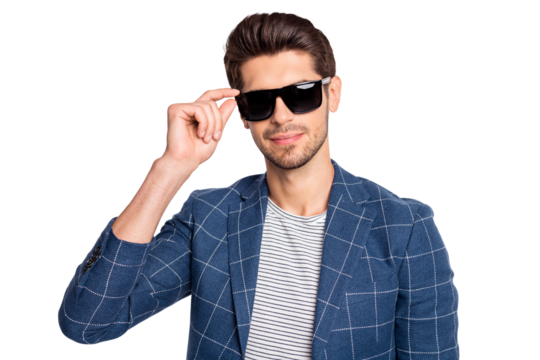 Close-up portrait of his he nice attractive lovely charming content businessman wearing blue checked blazer modern look touching specs isolated over light white pastel background