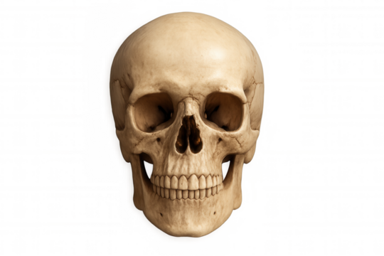 Frontal view of a human skull isolated on transparent background, perfect for anatomical studies, halloween projects, or any design needing a touch of macabre