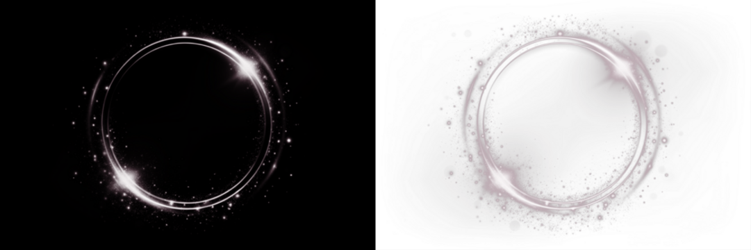 Elegant circular PNG overlay with sparkling effects on black and white backgrounds, perfect for enhancing designs and adding a touch of glamour to various creative projects
