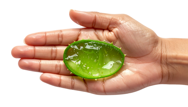 Fresh cut aloe vera held in female hand showing natural gel and healing texture on isolated background