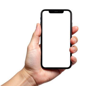 Hand holding a modern smartphone with a blank screen isolated on transparent background