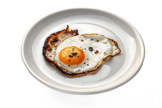Heavily burnt fried egg with blackened edges and overcooked yolk on a simple white plate, isolated on a transparent background