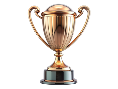 A golden trophy with an elegant design, featuring a large cup on a pedestal base, isolated against a white background