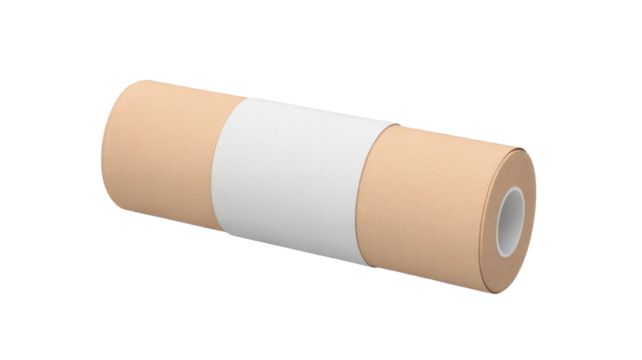 A rolled beige elastic bandage with textured fabric, partially unwrapped, isolated on transparent, representing medical support, injury care, first aid