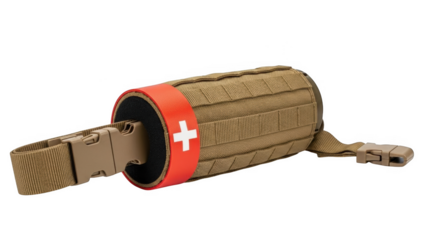 A red and white medical tourniquet is isolated on transparent background, ready for use in an emergency