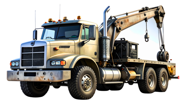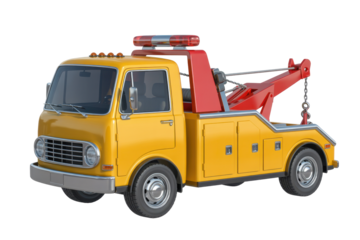 Yellow tow truck PNG isolated on transparent background, heavy duty vehicle for roadside assistance and recovery operations