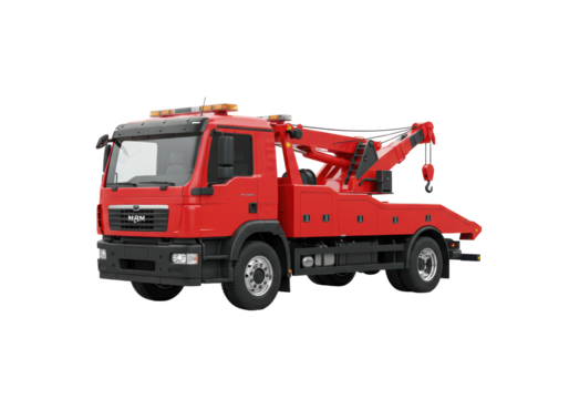 Isolated MAN recovery truck vehicle, red color, towing wrecker, heavy tow, car breakdown