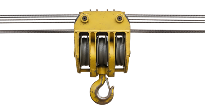Overhead crane system with visible hooks and pulleys for lifting components
