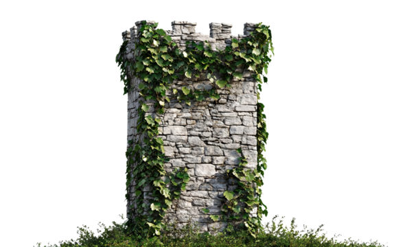 Medieval stone tower covered with ivy, isolated on transparent cutout background