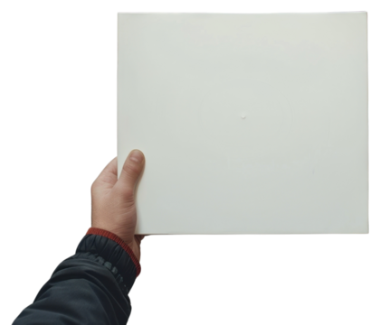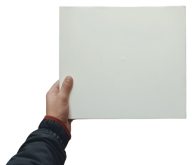 Hand holding blank square paper cover album vinyl record against street indoors finger person.