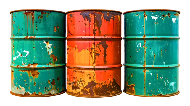 Old rusty metal oil barrel set isolated on white or transparent background