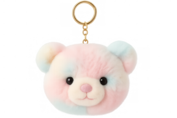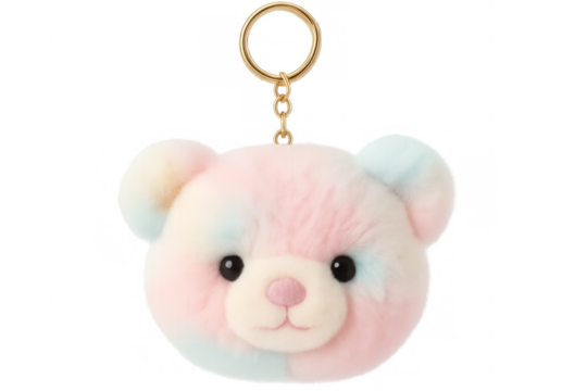 A fluffy brown teddy bear keychain holding a decorative antique brass key against a black background isolated on transparent background