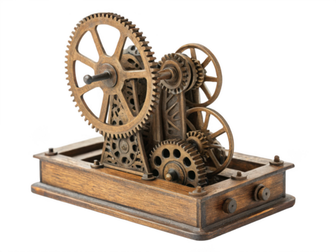 Antique Bronze Miniature Cannon Model with Gears Isolated on White Background