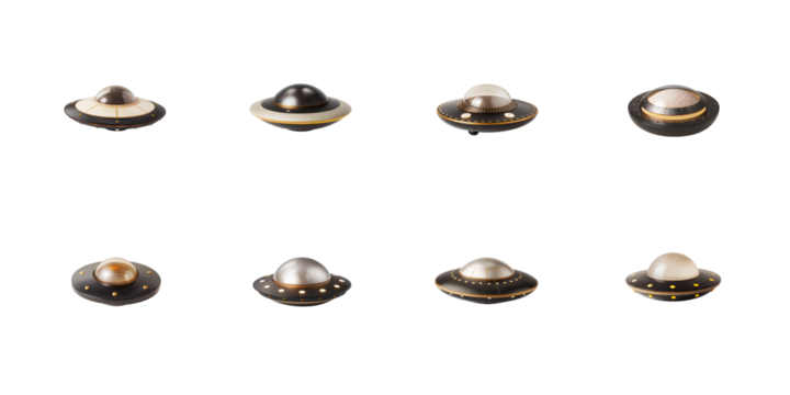Collection of eight detailed miniature flying saucer models displaying various cockpit designs on transparent background