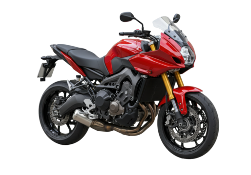 Isolated Yamaha MT-09 Tracer bike in red, motorcycle on a studio cutout, vehicle closeup view