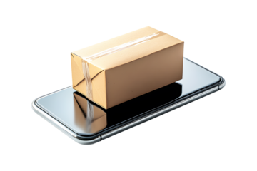 Online transportation in smartphone logistic concept isolated on cut out PNG or transparent background. Delivery, shopping, e-commerce. Box cardboard package emerging from smartphone screen symbol.