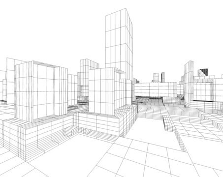 Renderizado en malla blanco y negro de edificios altos alineados sobre vía central en perspectiva digital.urbana y orden espacial, simbolizando planificación, estructura y abstracción arquitectónica.
