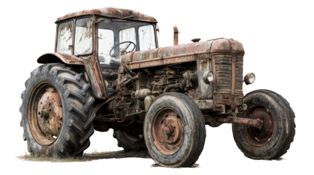 Abandoned Farm Tractor in Field background isolated on a Transparent background, PNG file.