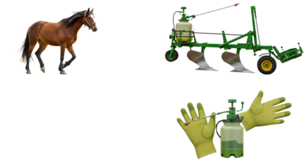 FARMING - Horse, agricultural plow, and protective gloves with sprayer isolated on white background, farming equipment and safety gear, perfect for agricultural presentations