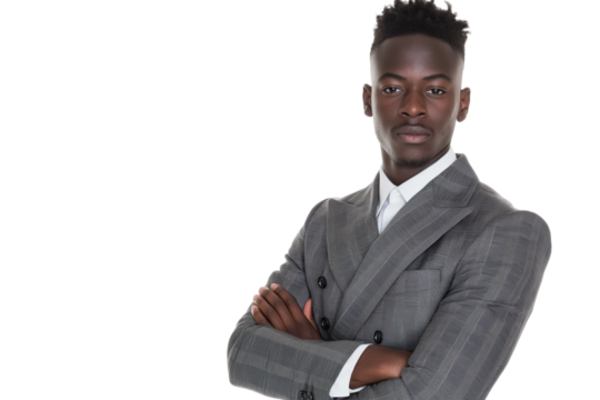 Reserved young Black male stock trader in double-breasted suit isolated on transparent white background