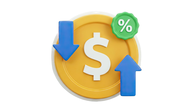 3D Icons: Dollar Sign, Up/Down Arrows, and Percentage Symbol