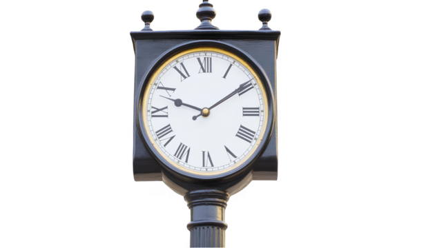 Elegant vintage clock showcasing Roman numerals and a classic design in a bright setting isolated on transparent background