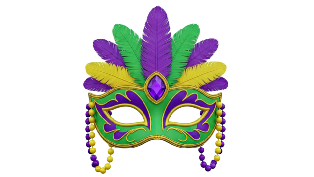A vibrant, ornate venetian masquerade mask with intricate details and colorful embellishments, isolated on transparent background