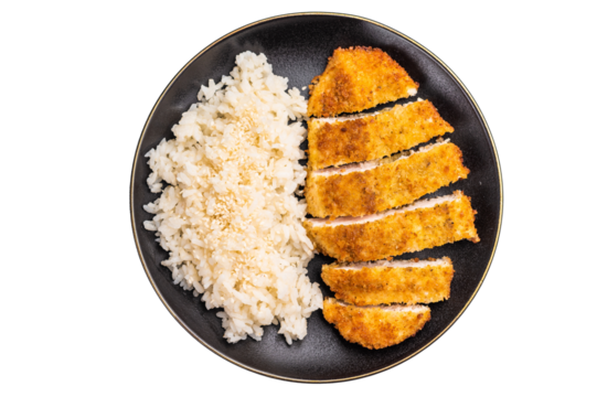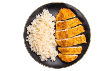 Delicious katsu style dish, featuring a perfectly cooked chicken meat cutlet served alongside steamed rice for a balanced meal. isolated on white background. top view