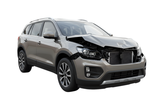 Damaged SUV with significant front-end collision damage, highlighting accident impact and insurance claim scenarios for automotive industries and insurance agencies
