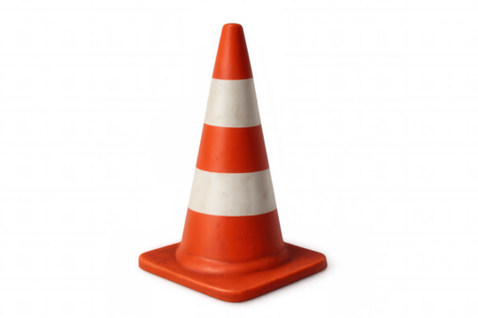 Bright orange traffic barrel with reflective white stripes for road construction and safety management isolated on transparent background