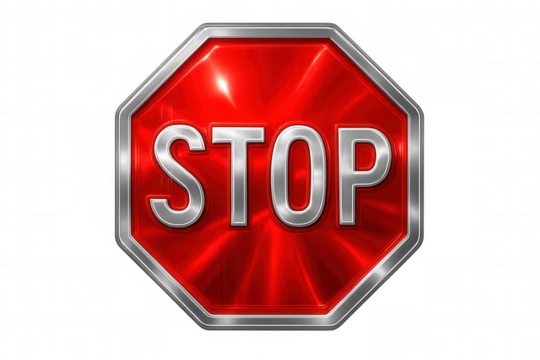 Metallic-framed red stop sign, isolated on transparent surface, emphasizing road safety communication